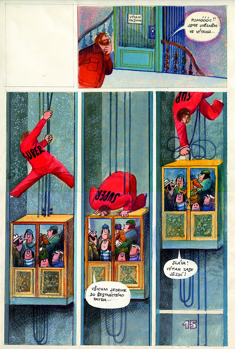 When one hears the word ‘comics’, most people will think of the recent flurry of films by large companies such as Marvel and D.C., which have helped characters such as Superman, Spiderman, Miss Marvel and Wonder Woman into the mainstream. Yet as a current exhibition at the Moravian Regional Museum shows, there is a whole different world to comics beyond these blockbuster productions, which also has a considerable tradition in central Europe. The World of Czech Comics (‘Český komiks a jeho svět’) focuses on the development of Czech and, to a lesser extent, Slovak comics from the early twentieth century to the present. Following recent publications, such as Signals from the Unknown. Czech Comics 1922-2012 and The History of Czechoslovak Comics in the 20th Century, the exhibition underscores the continuous development of Czech of comics and comic strips throughout a century of social and political change and challenges the assumption that comics are primarily for children.1